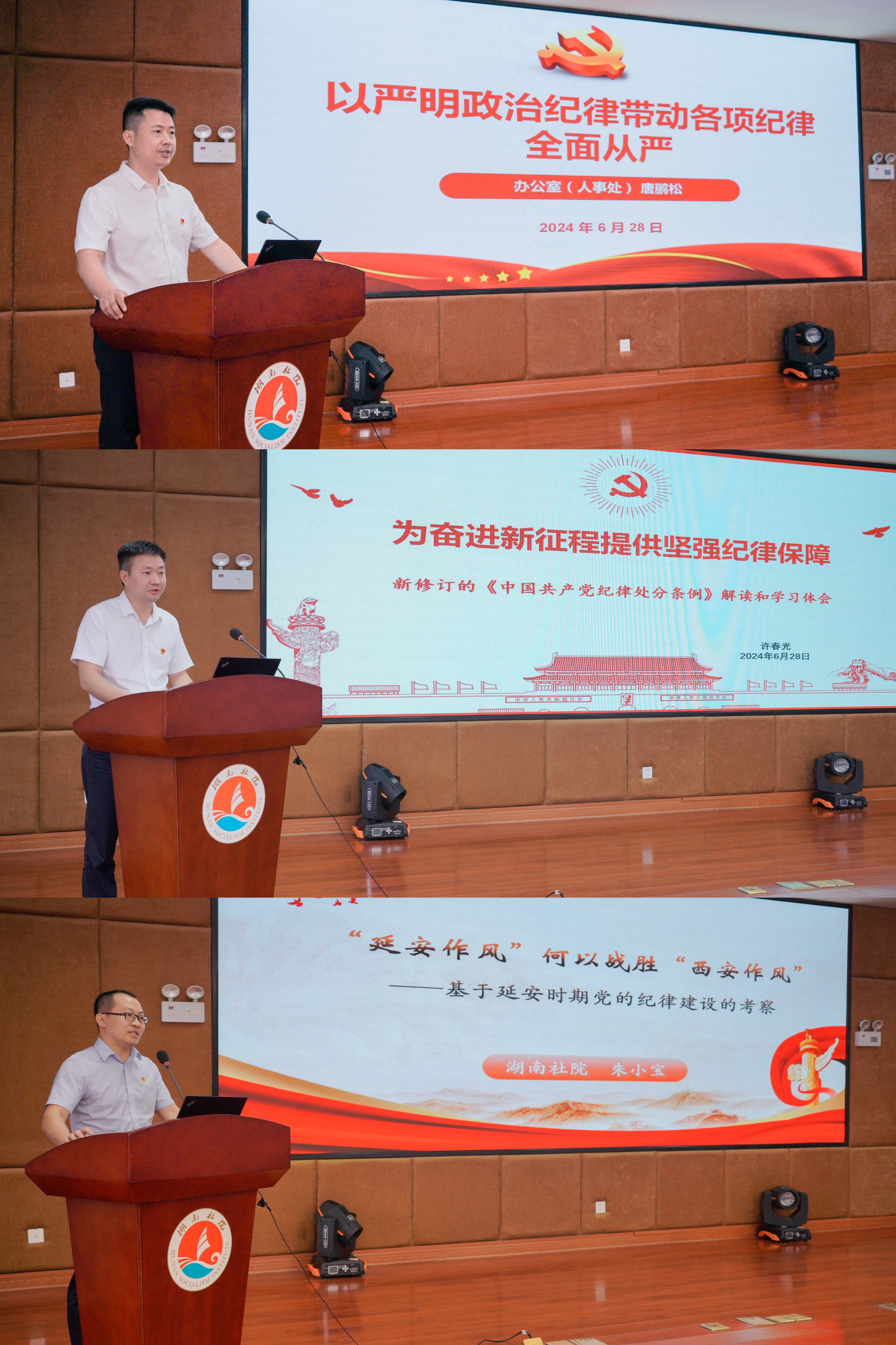会上,U8在线(人事处)主任唐鹏松从深刻认识严明政治纪律的重大意义、认真学习严明政治纪律的负面清单、以严明政治纪律带动各项纪律全面从严三个方面分享严明政治纪律的重要性和要求;机关纪委书记许春光从《中国共产党纪律处分条例》修订的历史沿革、修订的重大意义和学习新修订的《条例》的感悟和收获三个方面分享自己的体会;科研处副教授朱小宝以“延安作风”何以战胜“西安作风”为切入口,讲述加强纪律建设的重要性。分管院领导分别对3名同志的讲述进行点评,并结合工作落实提出意见建议。