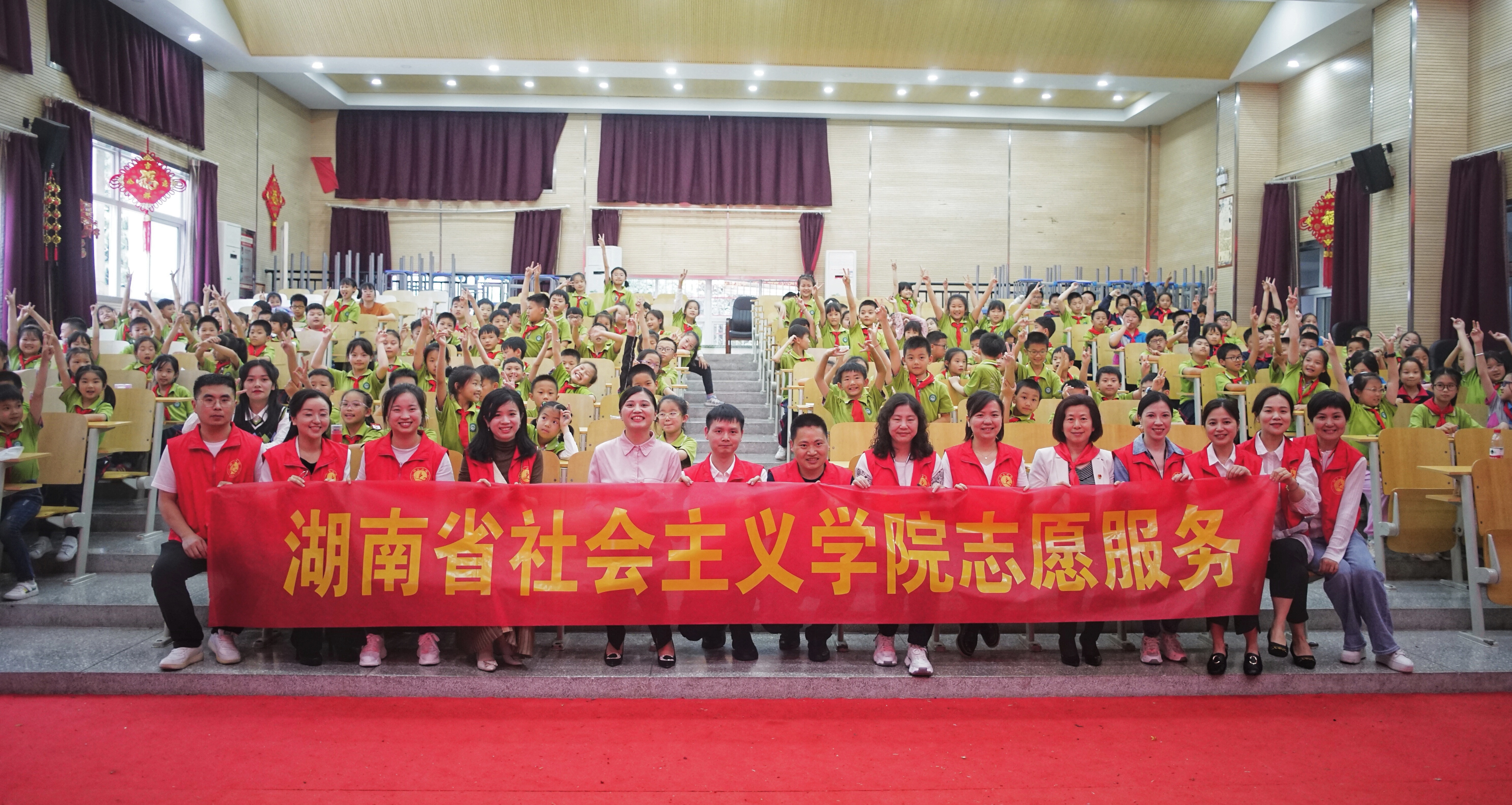 5月28日下午,省社会主义学院“学党史、守初心、共成长”主题教育活动走进长沙市博才阳光实验小学,党组成员、副院长彭英带队并致词,学院10余名教师志愿者与博才阳光实验小学师生亲密互动。