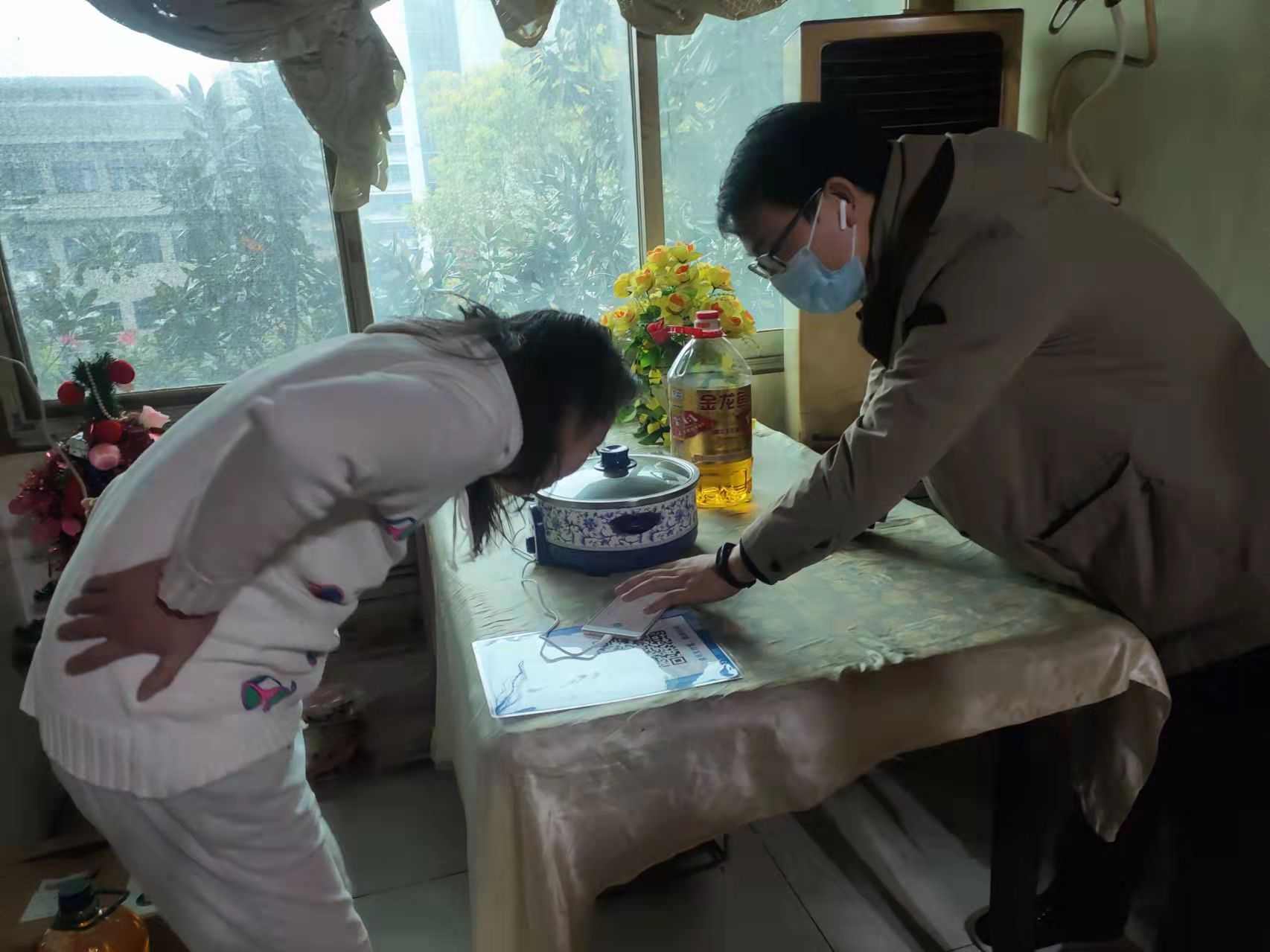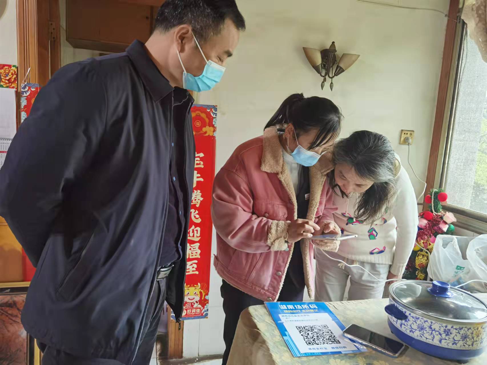 在李洪家中,工作人员现场教授她使用健康码、行码卡,告知她场所码的重要性,提醒要做好个人防护,疫情期间非必要不要外出,如有困难及时寻求学院工作人员的帮助。李洪表示,会遵守疫情防控规定和学院的管理要求,并对学院的关心表示感谢。