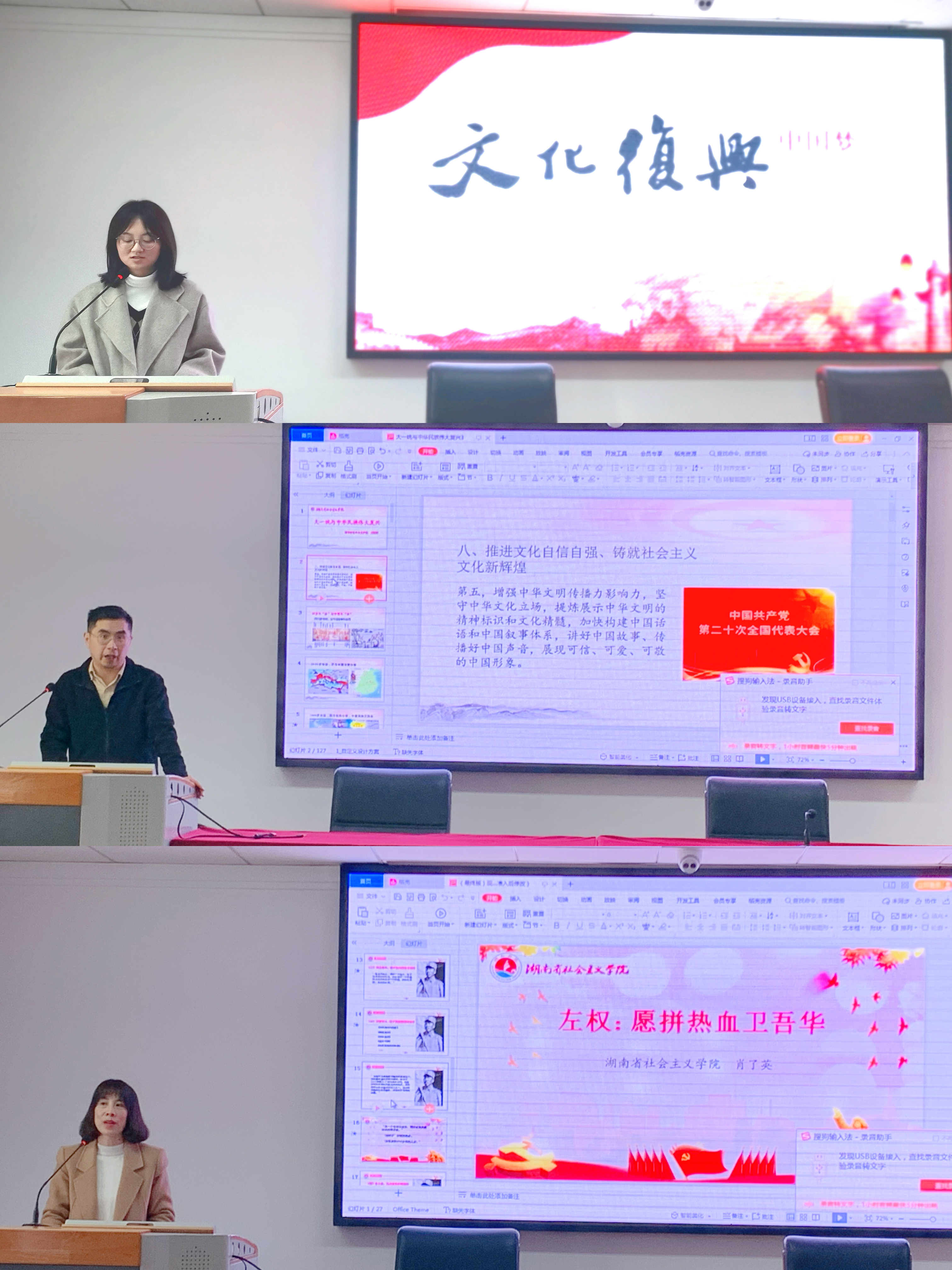 七位老师结合自己的研究领域和原有相关教学专题,就二十大精神进课程进课堂,进行了详细具体的汇报展示。